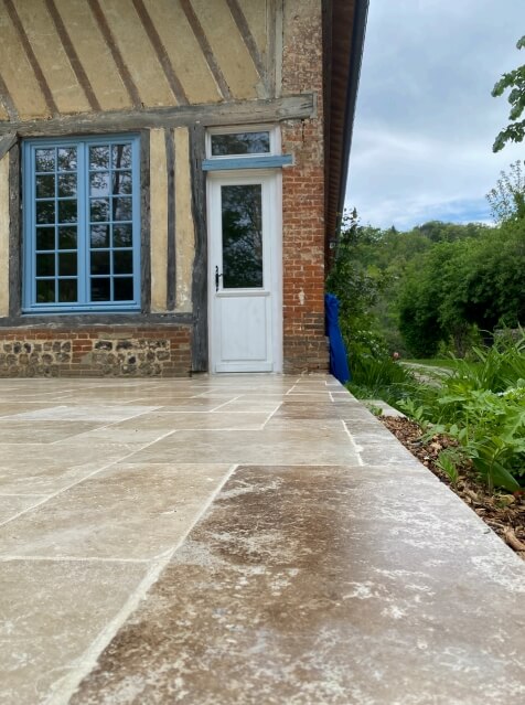 Création d’une terrasse en travertin et d’un muret de soutènement en brique ancienne
